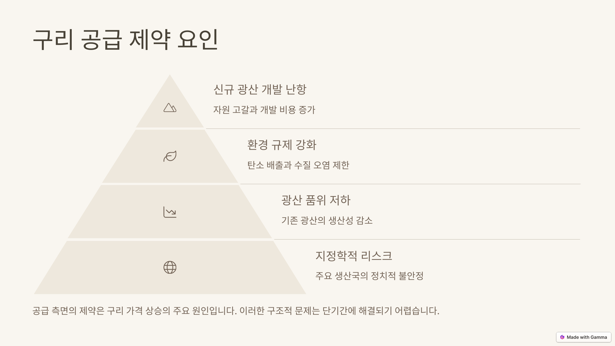 구리 가격은 국제 시장과 거시경제 변수에 민감하게 반응하기 때문에 가격 변동성과 글로벌 수급 변화가 주요 리스크입니다.