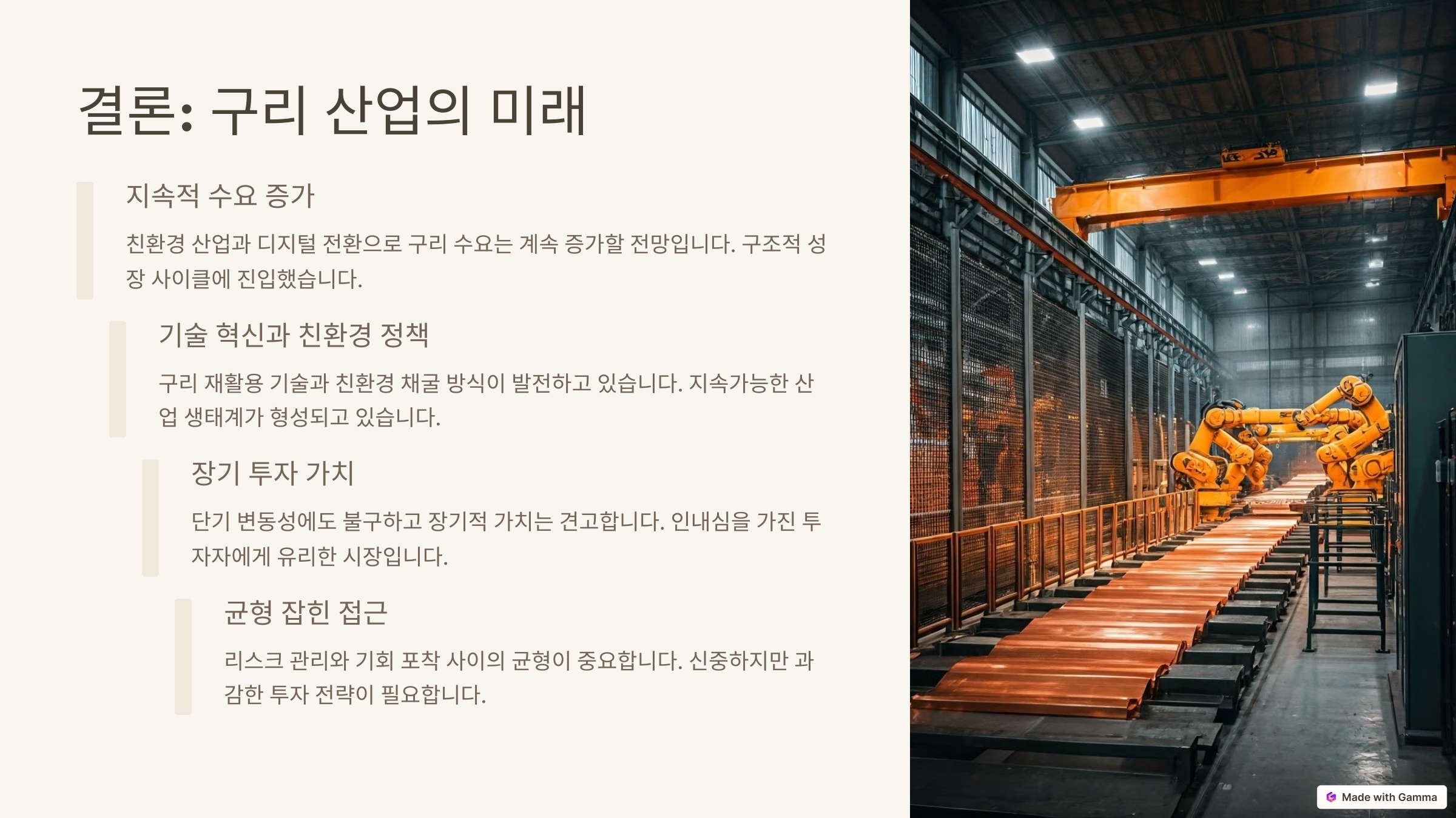 단기적인 시세보다는 장기적인 산업 구조 변화를 바라보고 투자하는 것이 바람직하며, 친환경·디지털화 시대에 더욱 중요해질 구리 산업에 대한 꾸준한 관심이 필요합니다.