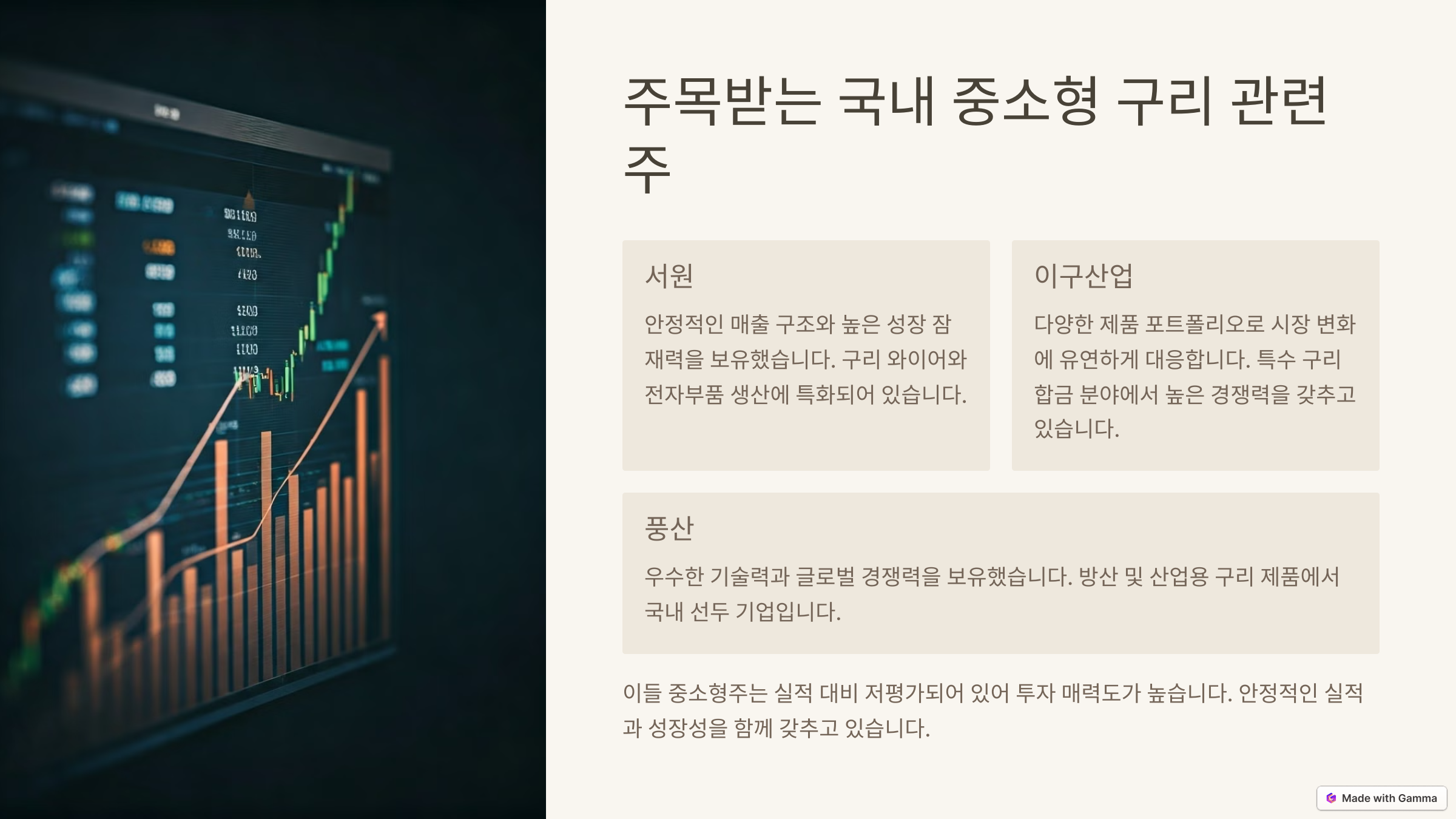 글로벌 경기 회복과 더불어 친환경 에너지로의 전환이 가속화되면서 구리의 전략적 중요성은 더욱 커지고 있으며, 국내 중소형주 중에서도 저평가된 종목들이 재조명되고 있습니다.